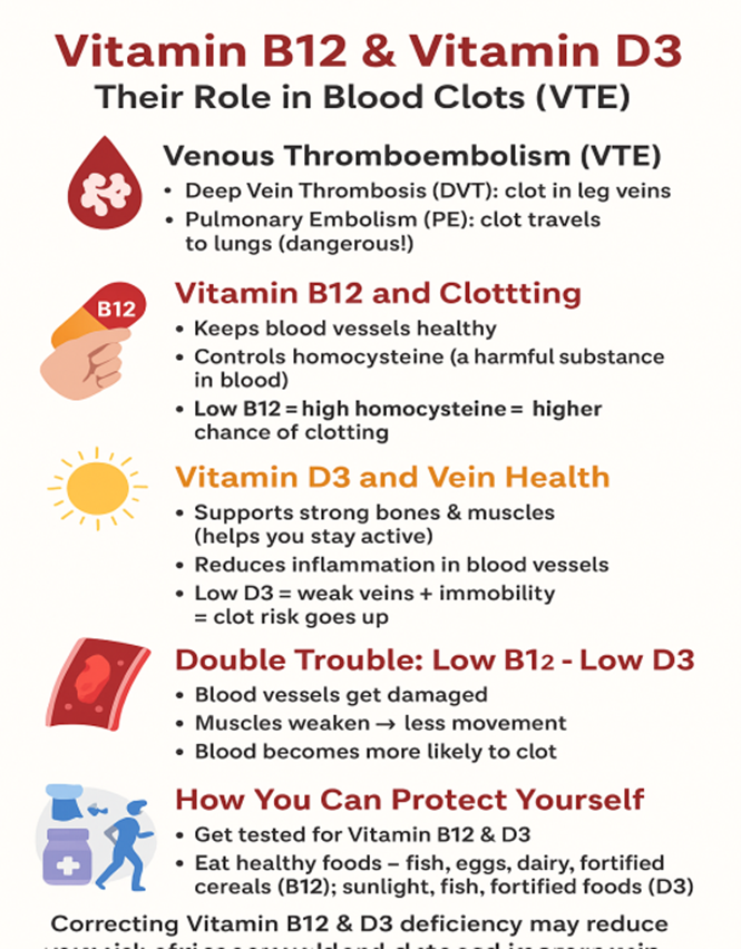 Most people know risk factors like sitting toolong, surgery, or obesity. But did you know 👉 VitaminB12 and Vitamin D3 deficiency can also increase clot risk?