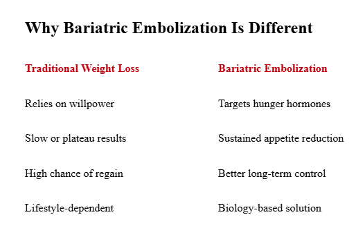 Modern science now explains why traditional weight-loss methods don’t work for everyone and how Bariatric Embolization, a minimally invasive procedure, is emerging as a promising solution.